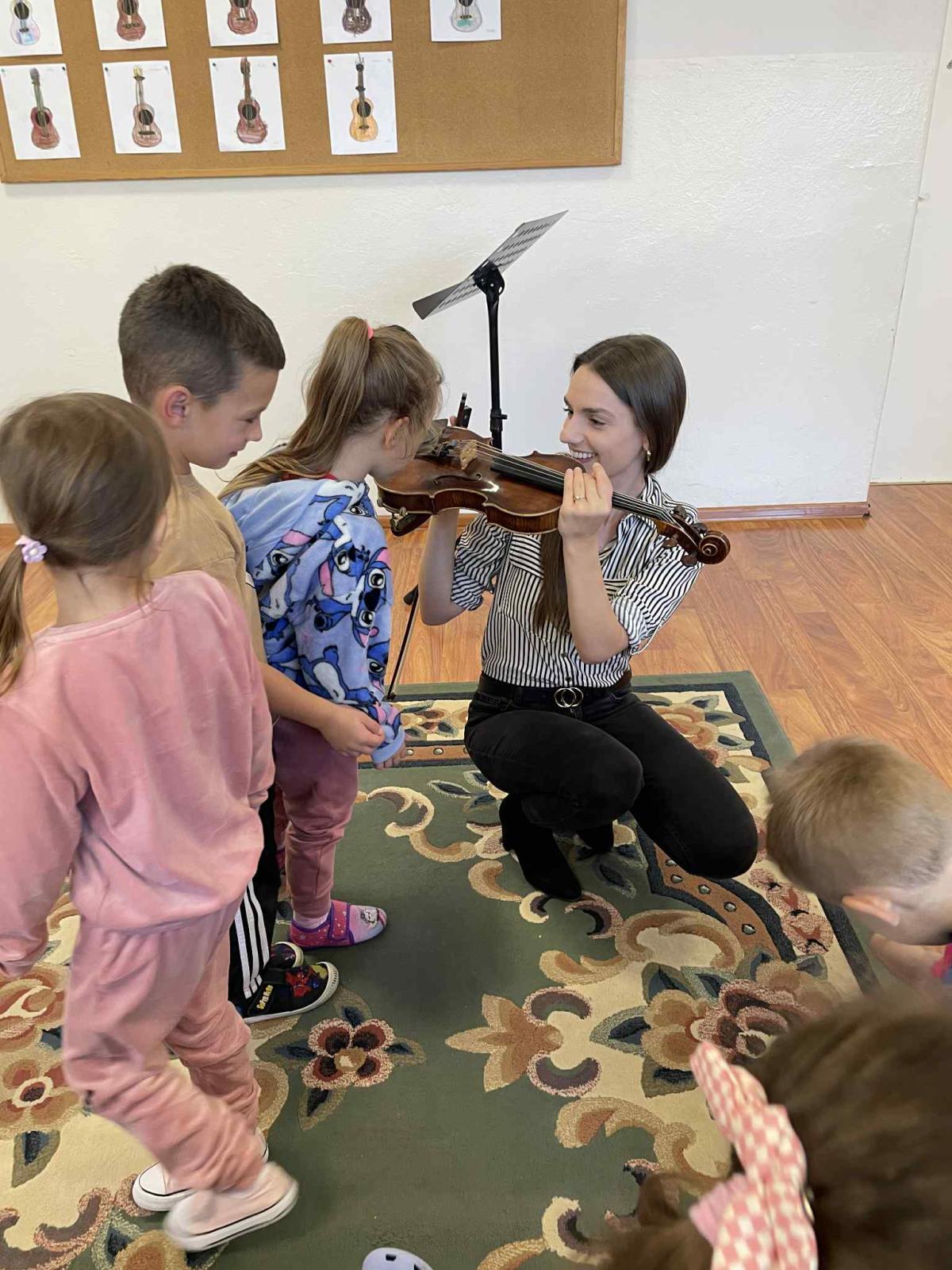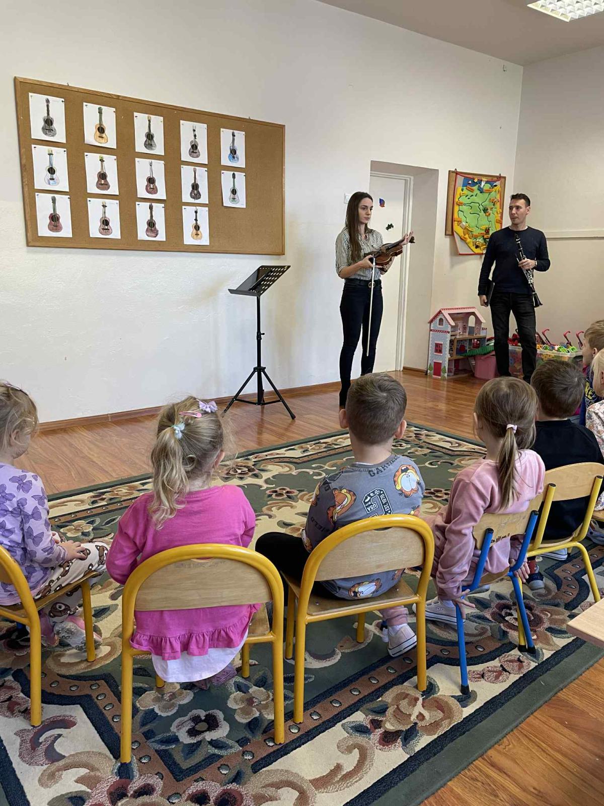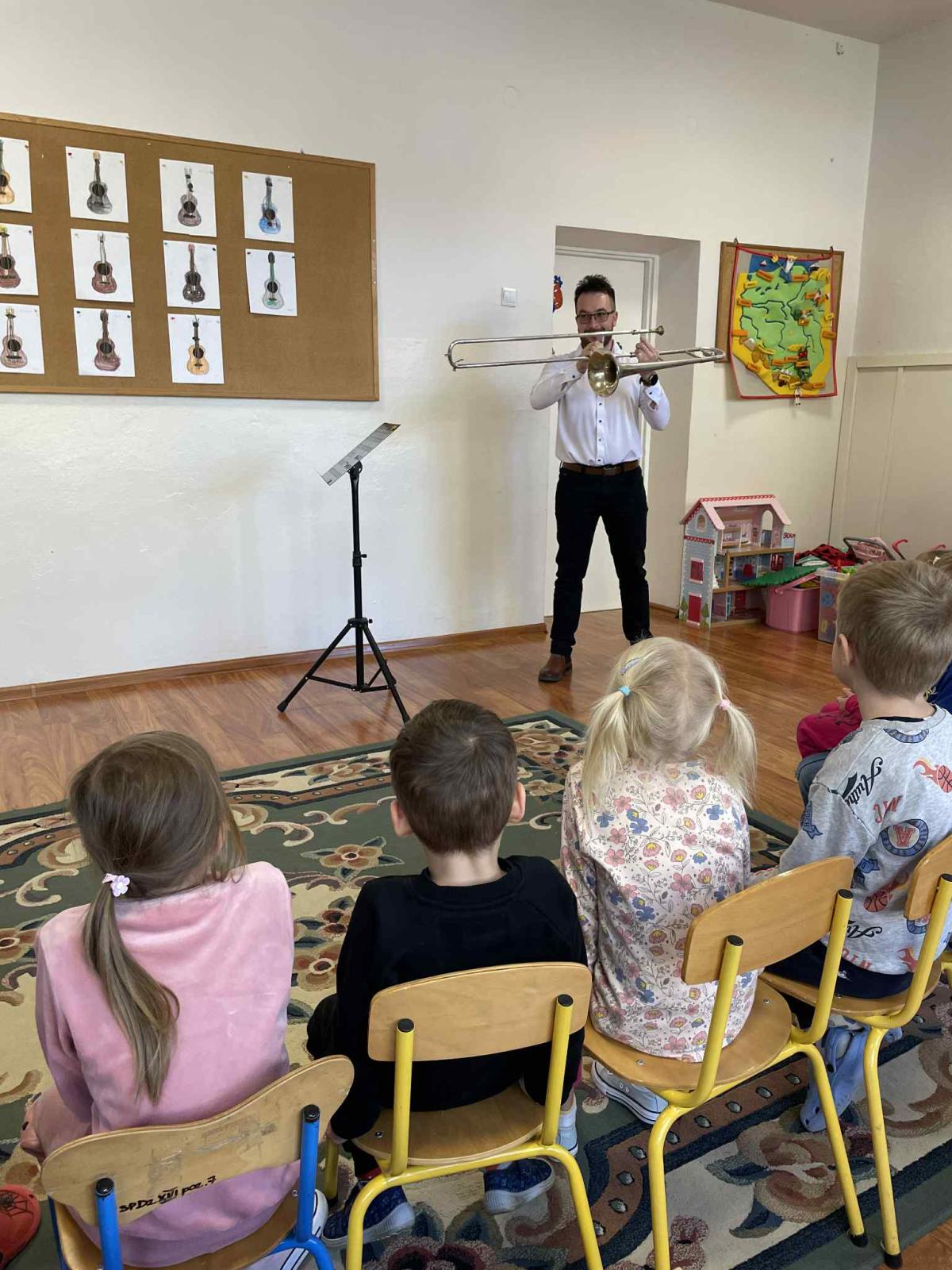 Uwieńczeniem wszystkich aktywności muzycznych było spotkanie z muzykami ze Szkoły Muzycznej, którzy chętnie dzielili się z przedszkolakami wiedzą z zakresu muzyki i instrumentów. Dzieci zapoznały się z budową i brzmieniem klarnetu, skrzypiec, fortepianu i puzonu. Mogliśmy posłuchać kilku utworów z repertuaru dziecięcego.