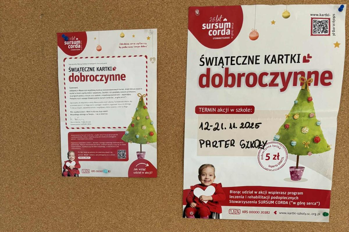 Szkolny Klub Wolontariatu zaprasza całą społeczność szkolną do włączenia się w świąteczną akcję charytatywną – sprzedaż kartek świątecznych przygotowanych przez Stowarzyszenie Sunsum Corda.