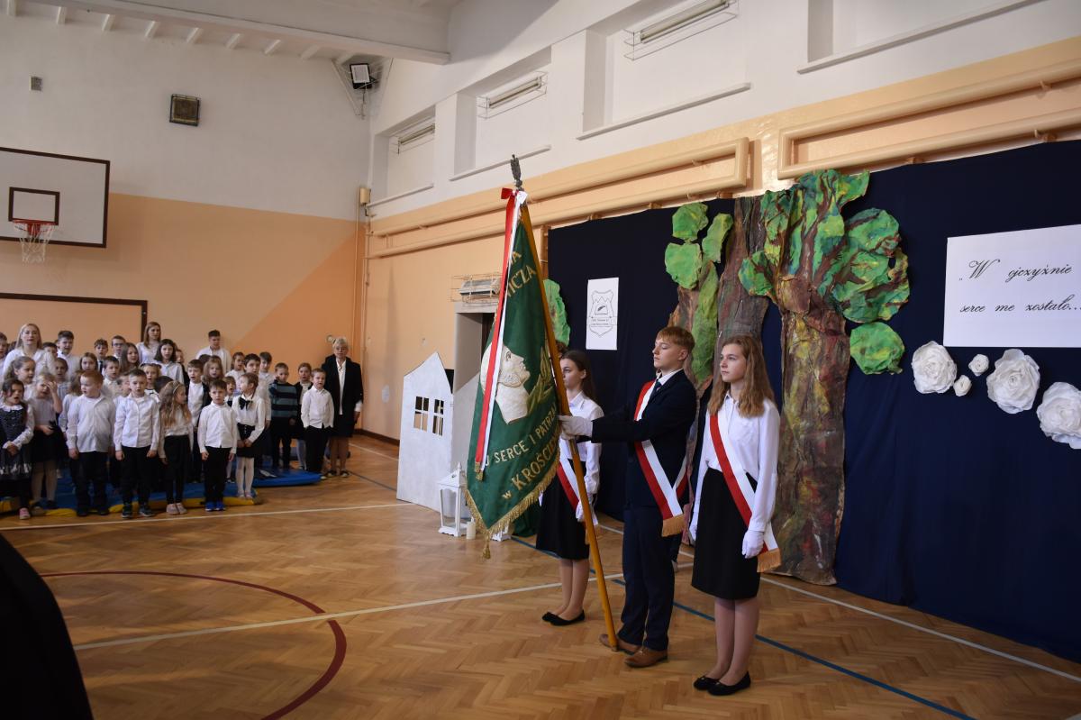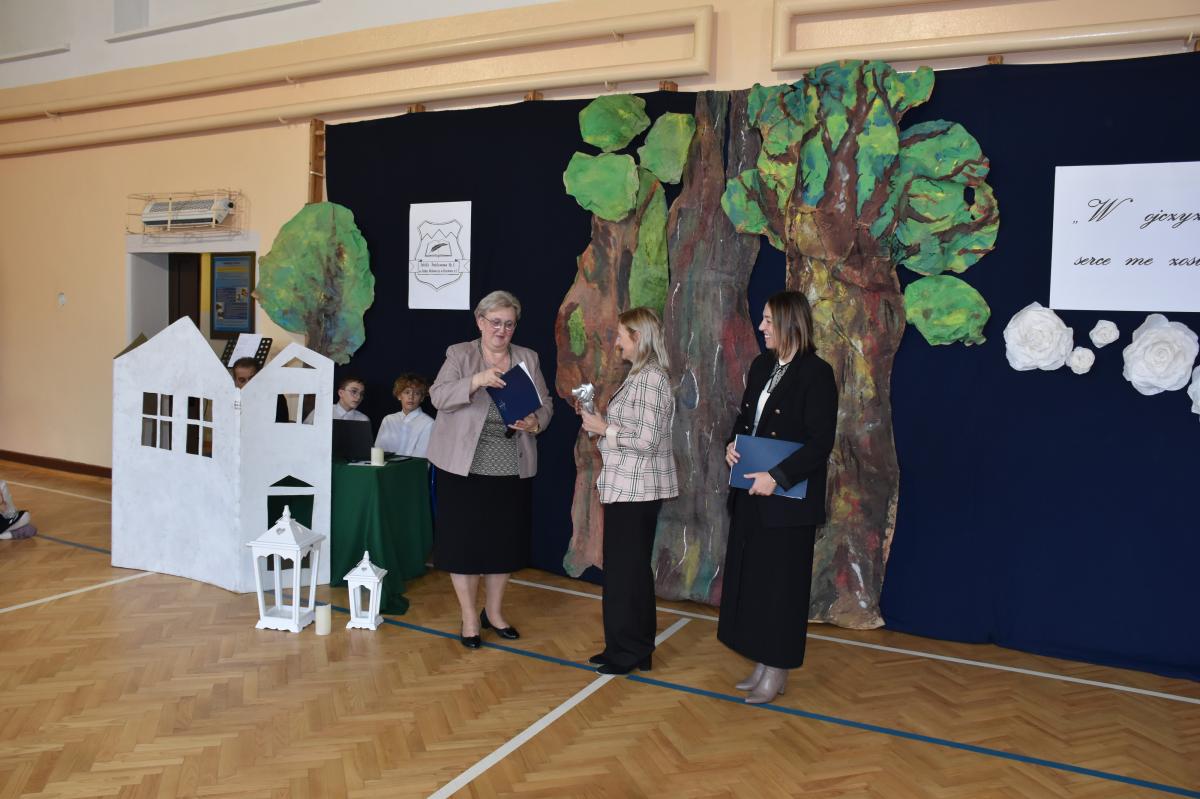 Publiczna w Krościenku nad Dunajcem. Statuetkę odebrała Pani Weronika Walkowska- Dyrektor placówki. Następnie uczniowie przedstawili montaż słowno- muzyczny